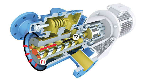 Der hohe Eingangsdruck wirkt direkt auf die Stirnfläche der Hauptantriebsspindel sowie auf die Nebenspindeln (F1). Ein Teil der Kraft wird auf der Druckseite der Hauptspindel kompensiert (F2). Die resultierende Axialkraft würde normalerweise eine hohe axiale Belastung auf das Lager ausüben, was aber bei einer Magnetkupplung nicht der Fall ist.