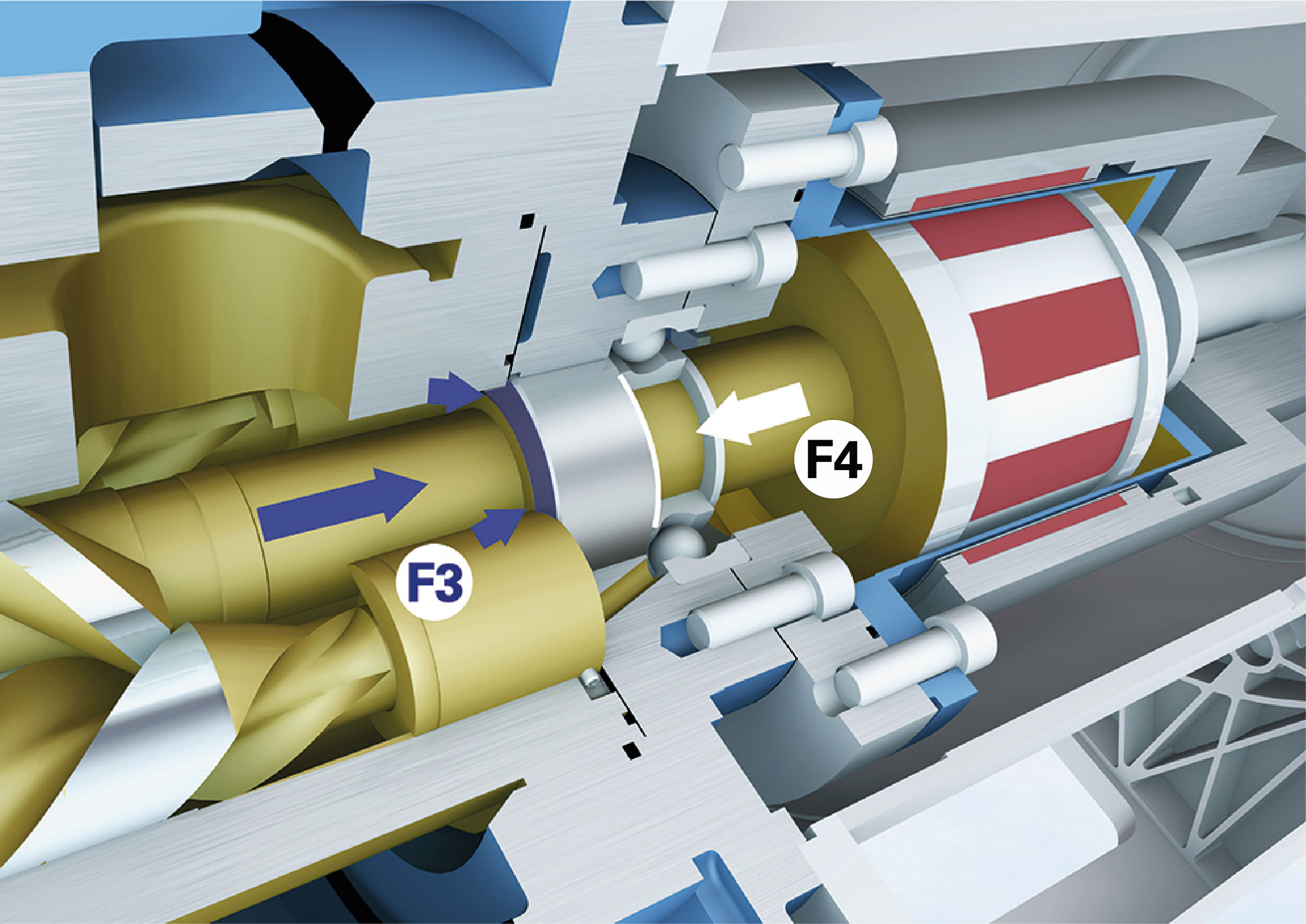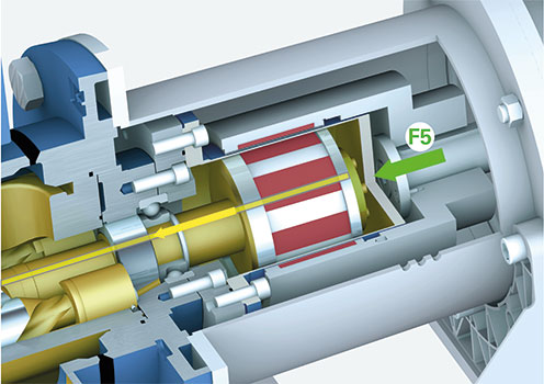 Dank einer durch die Mitte der Antriebsspindel verlaufenden Bohrung sind die saugseitigen Druckbedingungen auch innerhalb des Spalttopfs der Magnetkupplung gegeben. Aufgrund dieser speziellen Bauweise wird durch das Medium eine Kraft (F5) erzeugt, die den restlichen Axialschub auf die Hauptspindel kompensiert. Die Lagerbelastung wird minimiert, was zu einem langen, störungsfreien Betrieb führt.