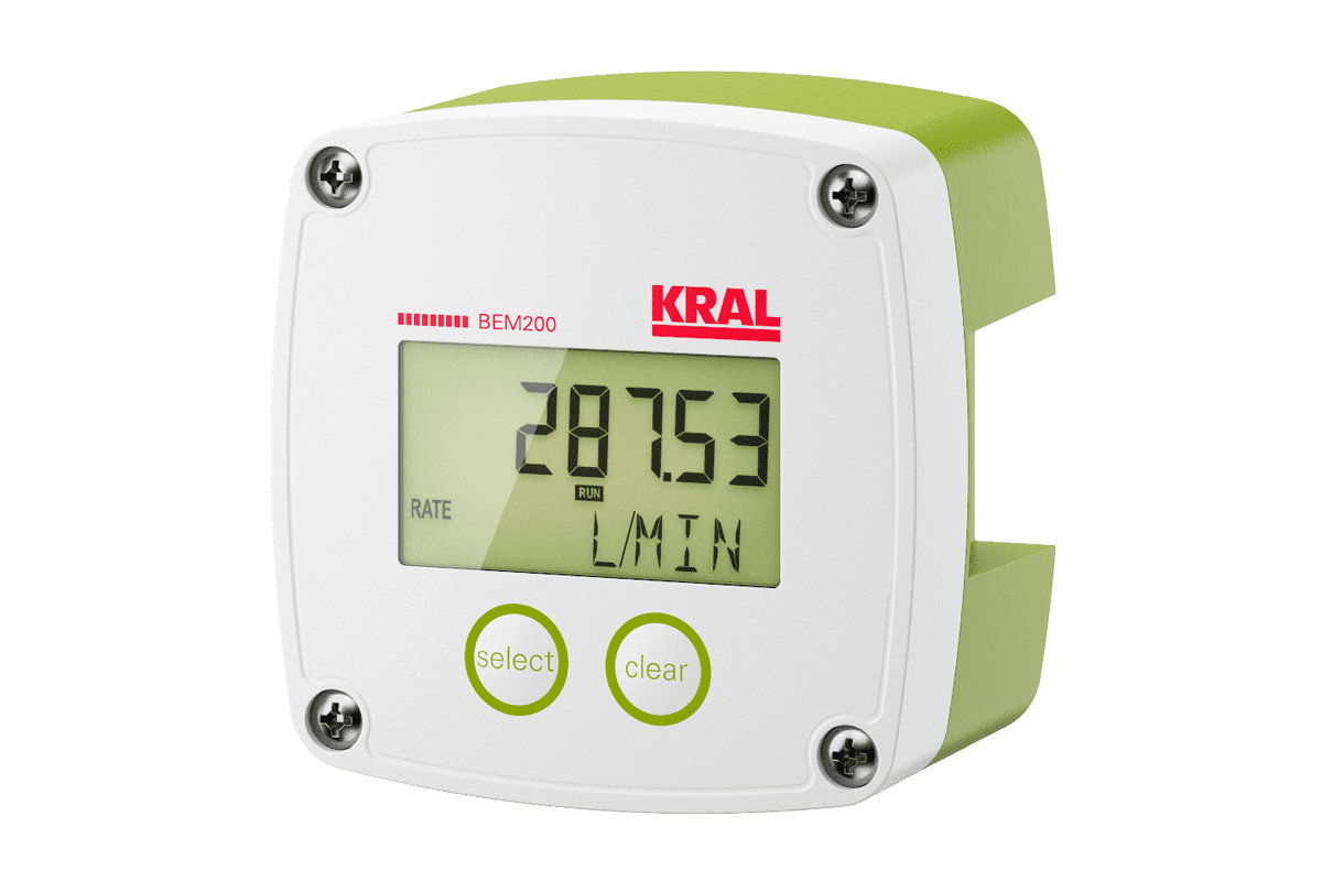 Die KRAL Anzeige- und Auswerteelektronik BEM 200 hat einen Mikroprozessor zur lokalen Anzeige der Werte für Durchflussrate, Total und akkumuliertes Total.